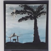 A traditional view of a nativity scene sees the family set in shadow under a moonlit sky with star. Each card is hand painted and completed and finished with real gemstones of labradorite for the star shimmer.