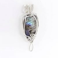 I love this labradorite. So beautifully cut that it shines out with colours on either side. For that reason, I set it in this silver plated frame, so that it can be worn either way round and finished it with the Sunago swirl, so it can be worn on either chains or ribbons. That way you can bring a little glamour to your everyday and stand out natural colours for your evening wear.